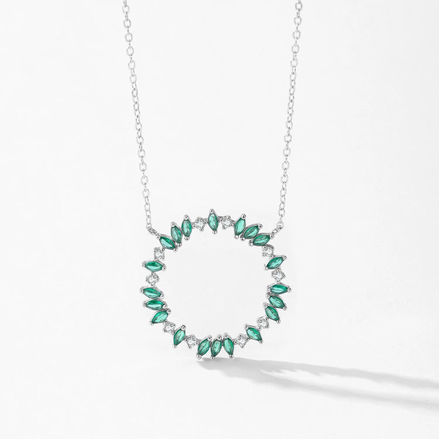 Bei der "FOREST SHINE" Sterling Silber Halskette bilden fein geschliffene grüne Steinlinsen und kleine Kristalle einen strahlenden Kreis, der Harmonie und natürliche Schönheit vereint.